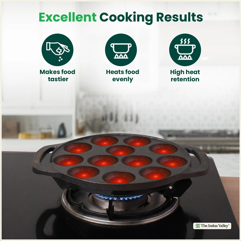 - Cast Iron Cookware is versatile and helps you cook many dishes like dosa, roti, gravy, deep frying, paniyaram, appam and more.