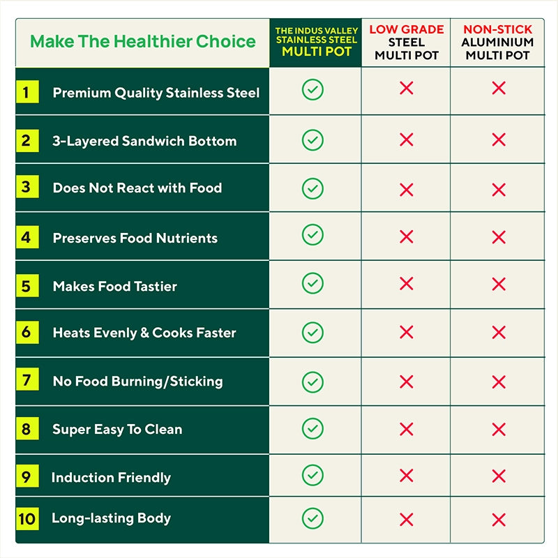 | The Indus Valley Tri-steel Cookware | Low Grade Steel Cookware | Non-Stick Aluminium Cookware | |