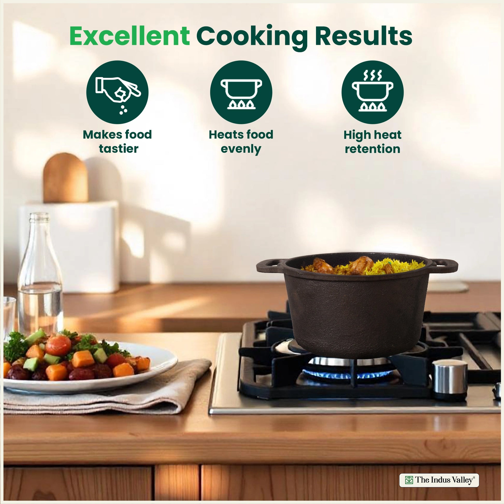 • Cast Iron Cookware is versatile and helps you cook many dishes like dosa, roti, gravy, deep frying, paniyaram, appam and more.