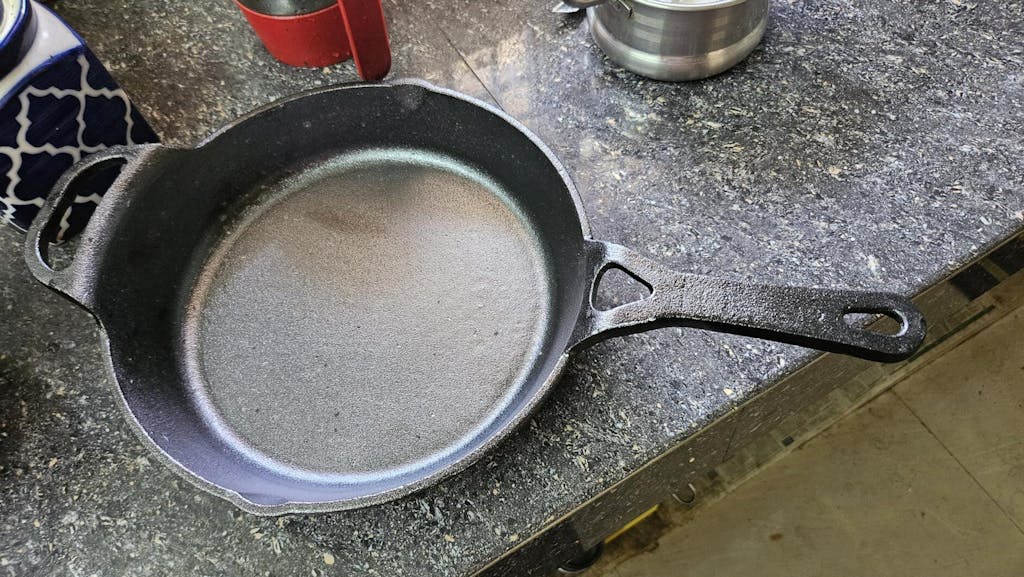 - 1. Wash cast iron fry pan with soapy water & a scrub pad.