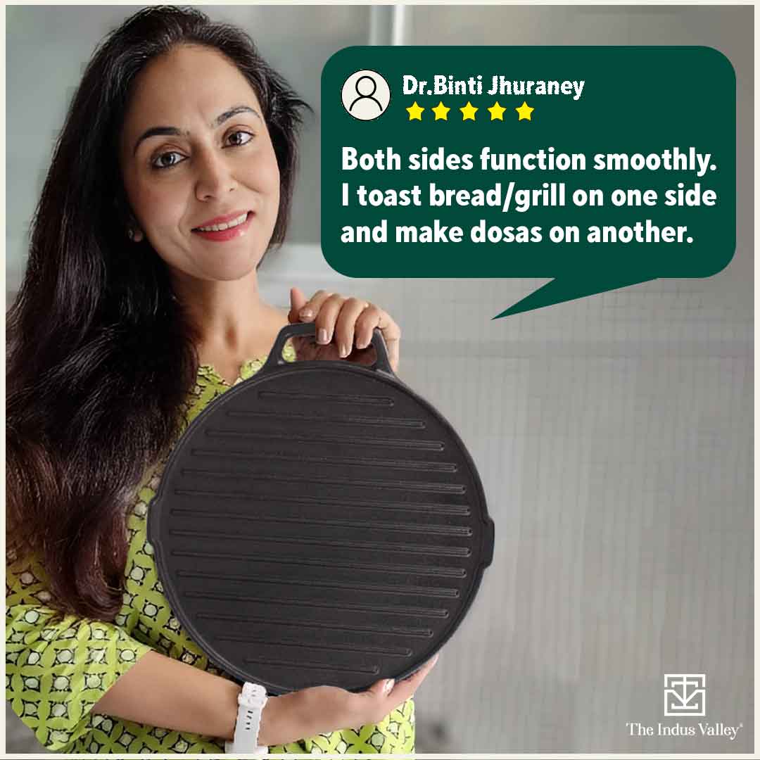 - Cast Iron Cookware is versatile and helps you cook many dishes like dosa, roti, gravy, deep frying, paniyaram, appam and more.