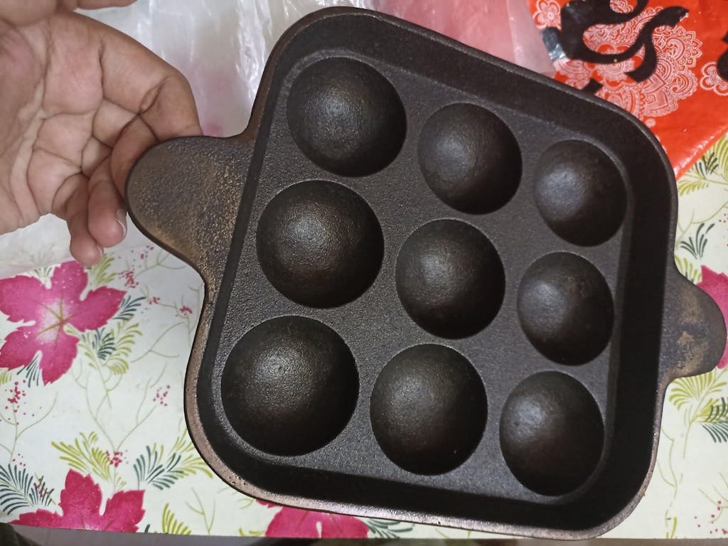 - 1. Wash cast iron paniyaram/appe pan with soapy water & a scrub pad.
