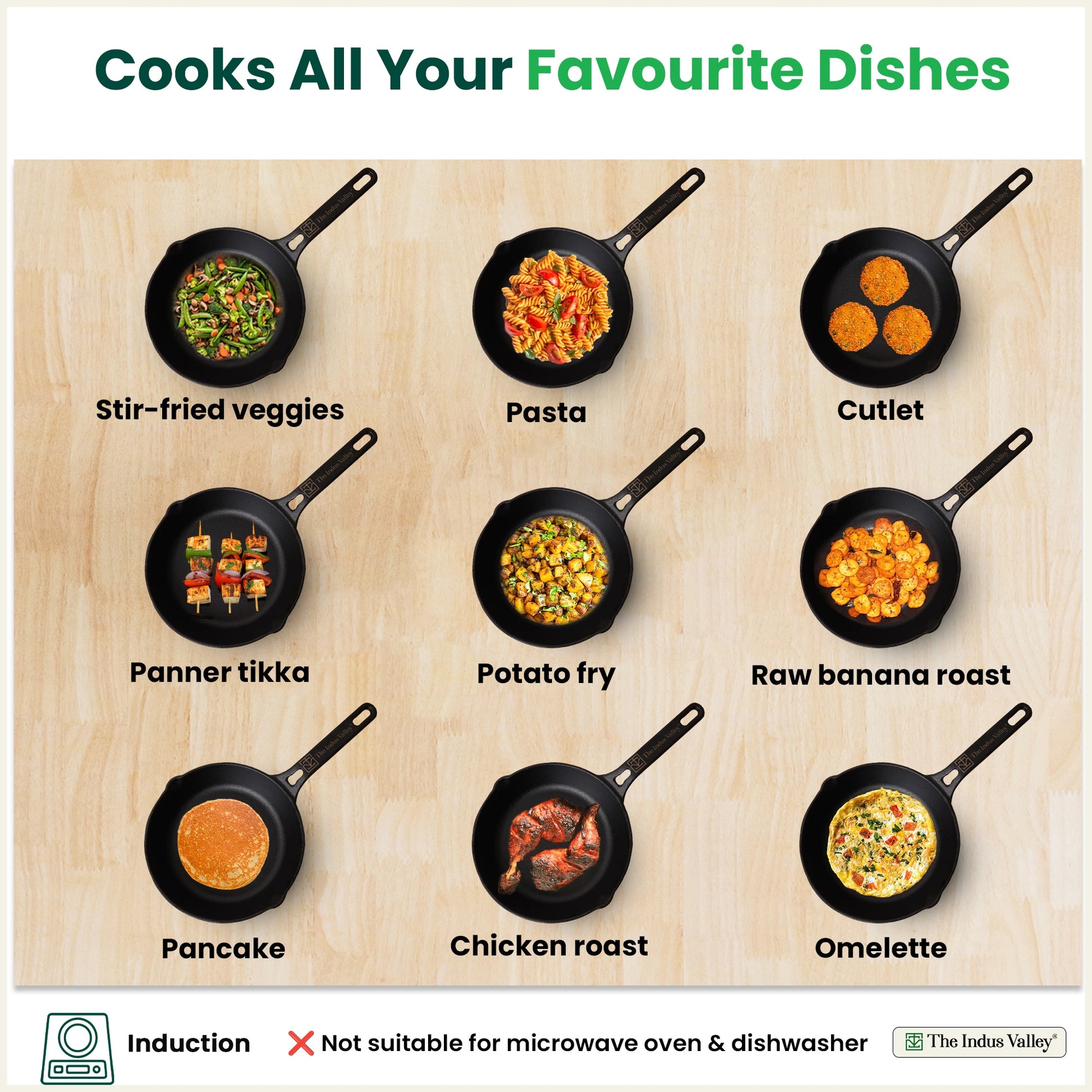 - Cast Iron Cookware is versatile and helps you cook many dishes like dosa, roti, gravy, deep frying, paniyaram, appam and more.