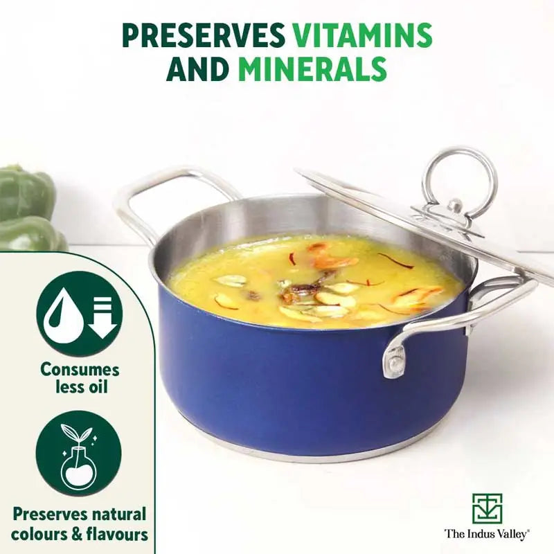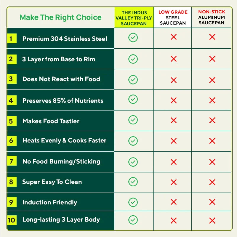 The Indus Valley Tri-steel Cookware | Low Grade Steel Cookware | Non-Stick Aluminium Cookware | |