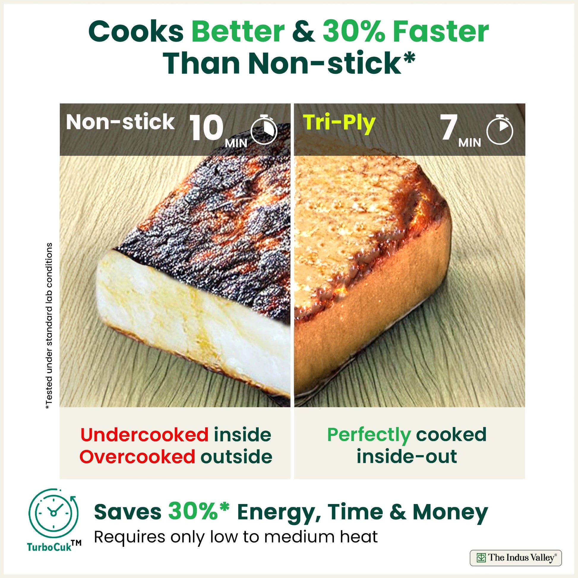 - 💪100% TOXIN-FREE:The Indus Valley’s TurboCukTM Triply Stainless Steel Frying Pan/Skillet is made of 100% food-safe metals, to give you a great, effortless cooking experience, without compromising on your health and ease of cooking.