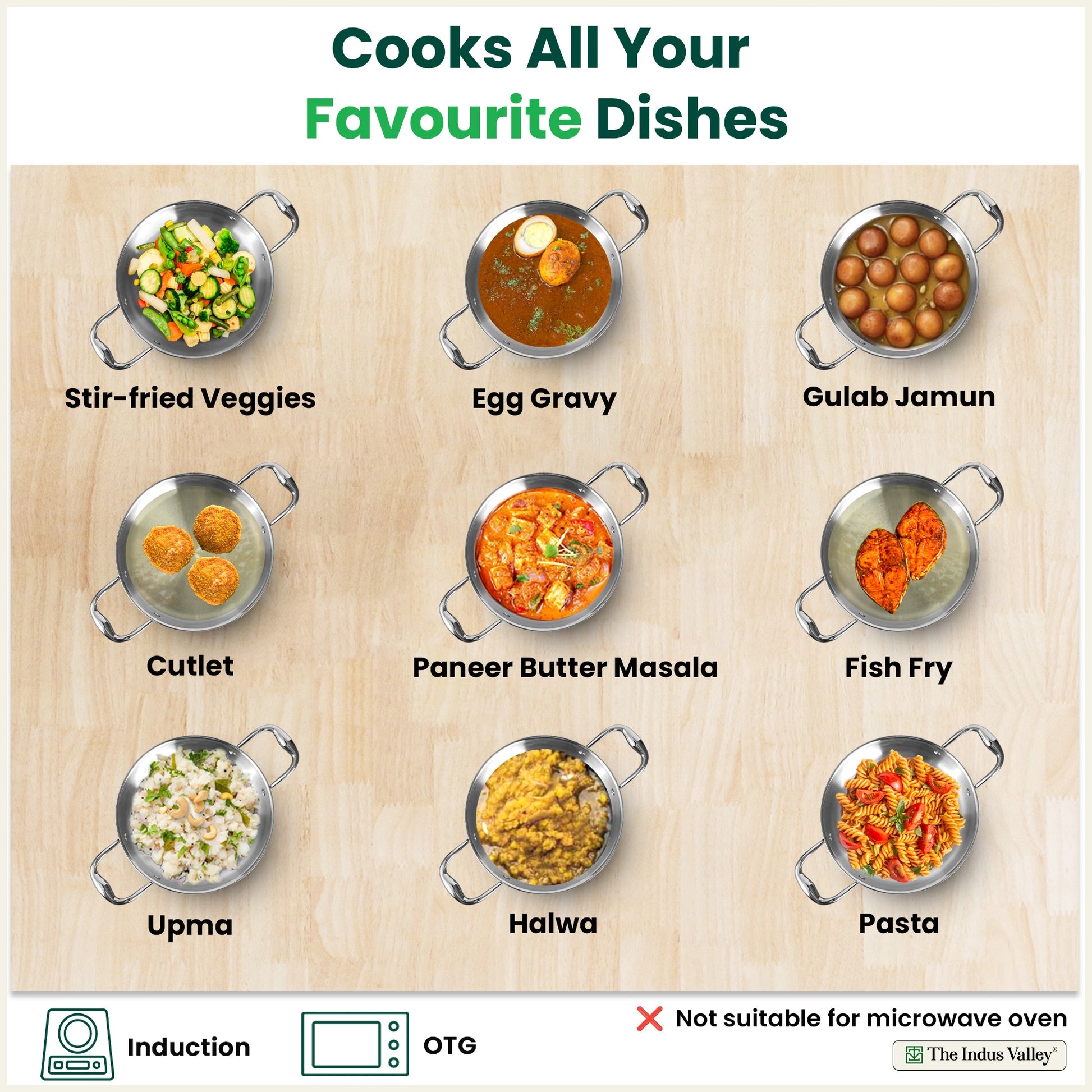 | The Indus Valley Tri-ply Cookware | Low Grade Steel Kadai | Non-stick Aluminium Kadai | |