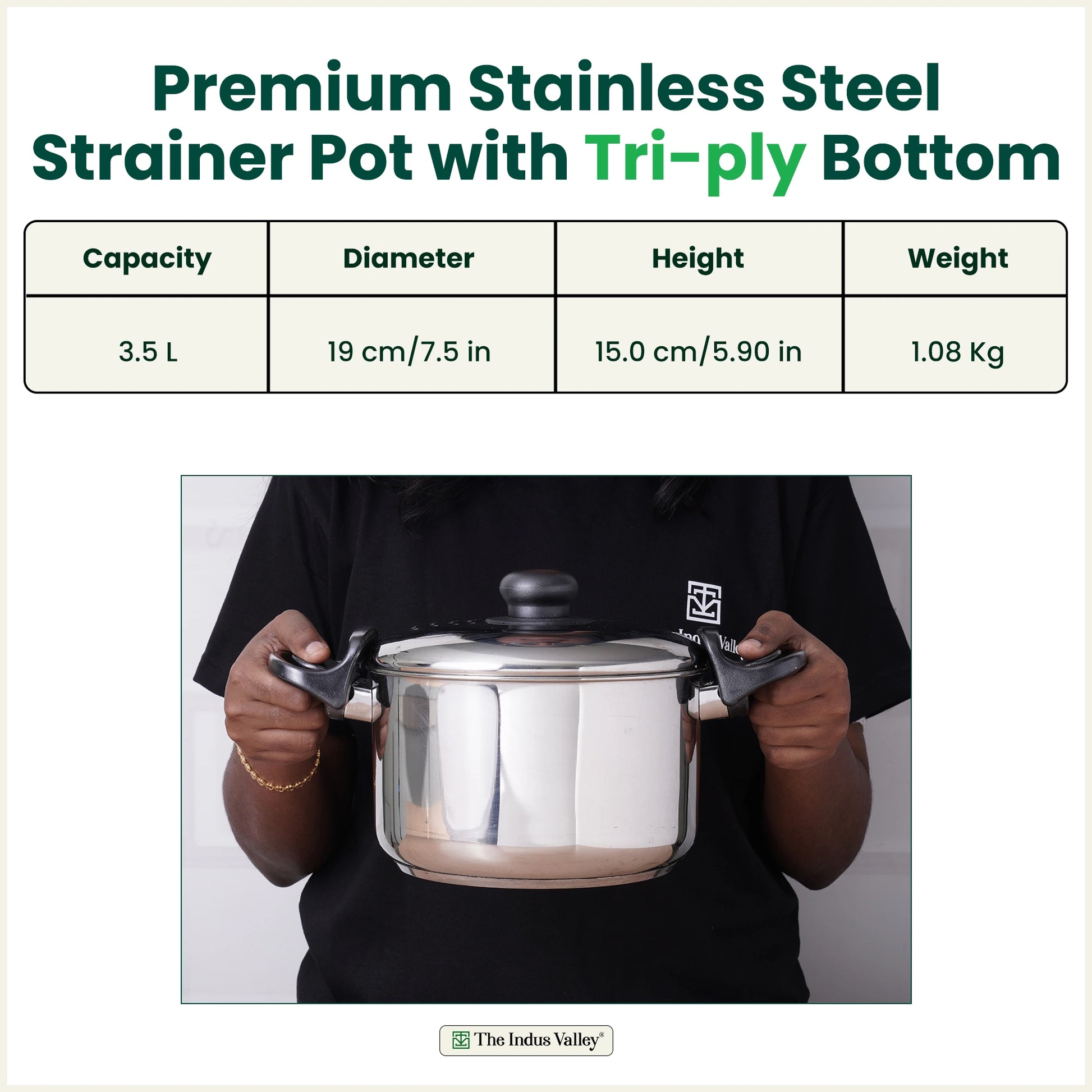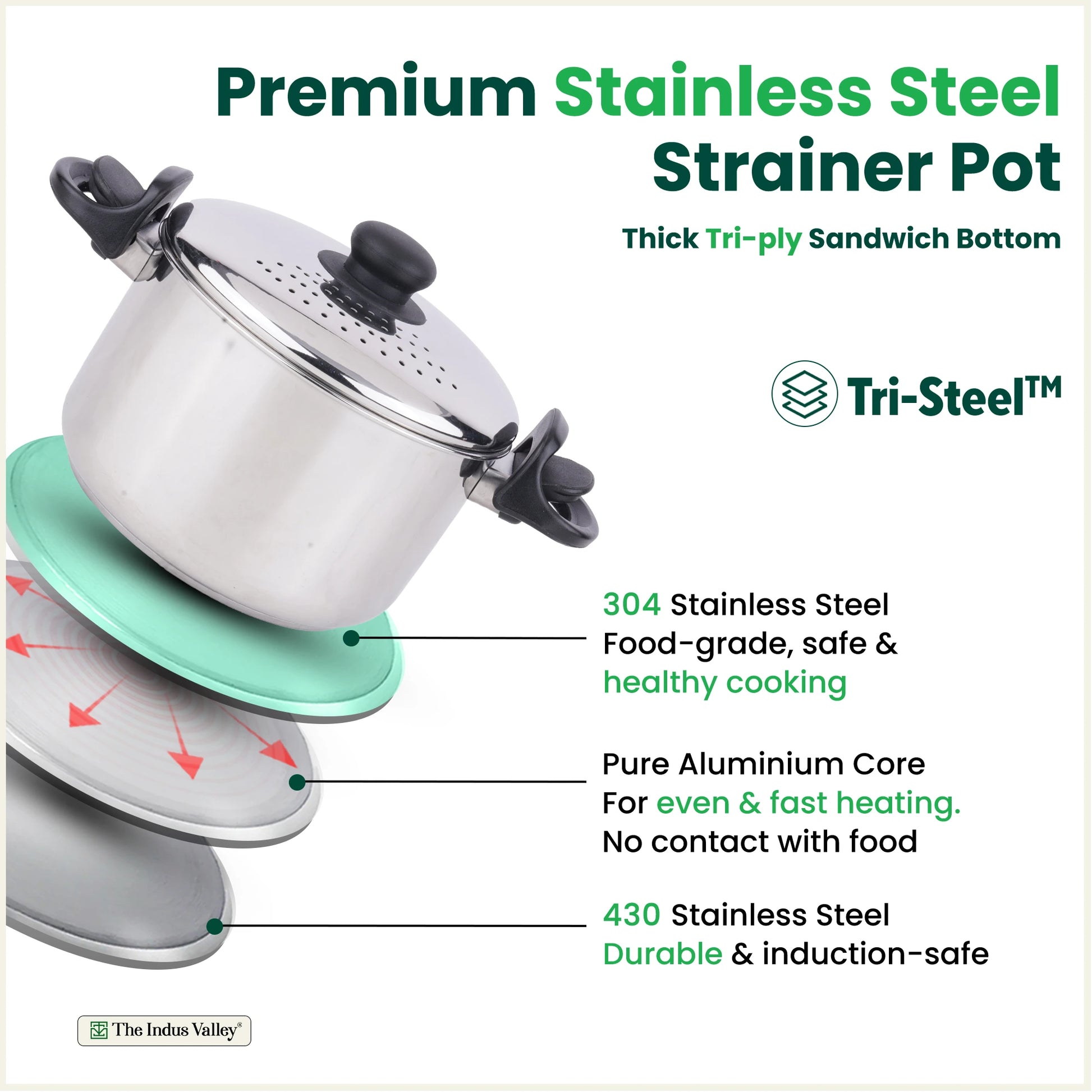 Tri-steel Stainless Steel Rice Pot with Strainer Lid & Lockable Bakelite Handles, Tri-ply 3-Layer Heavy Bottom | Noodle/Pasta/Corn/Soya/Veggies Boiler Pot, Steamer Cooker, Induction & Gas, 1.08 Kg, 19cm, 3.5 L