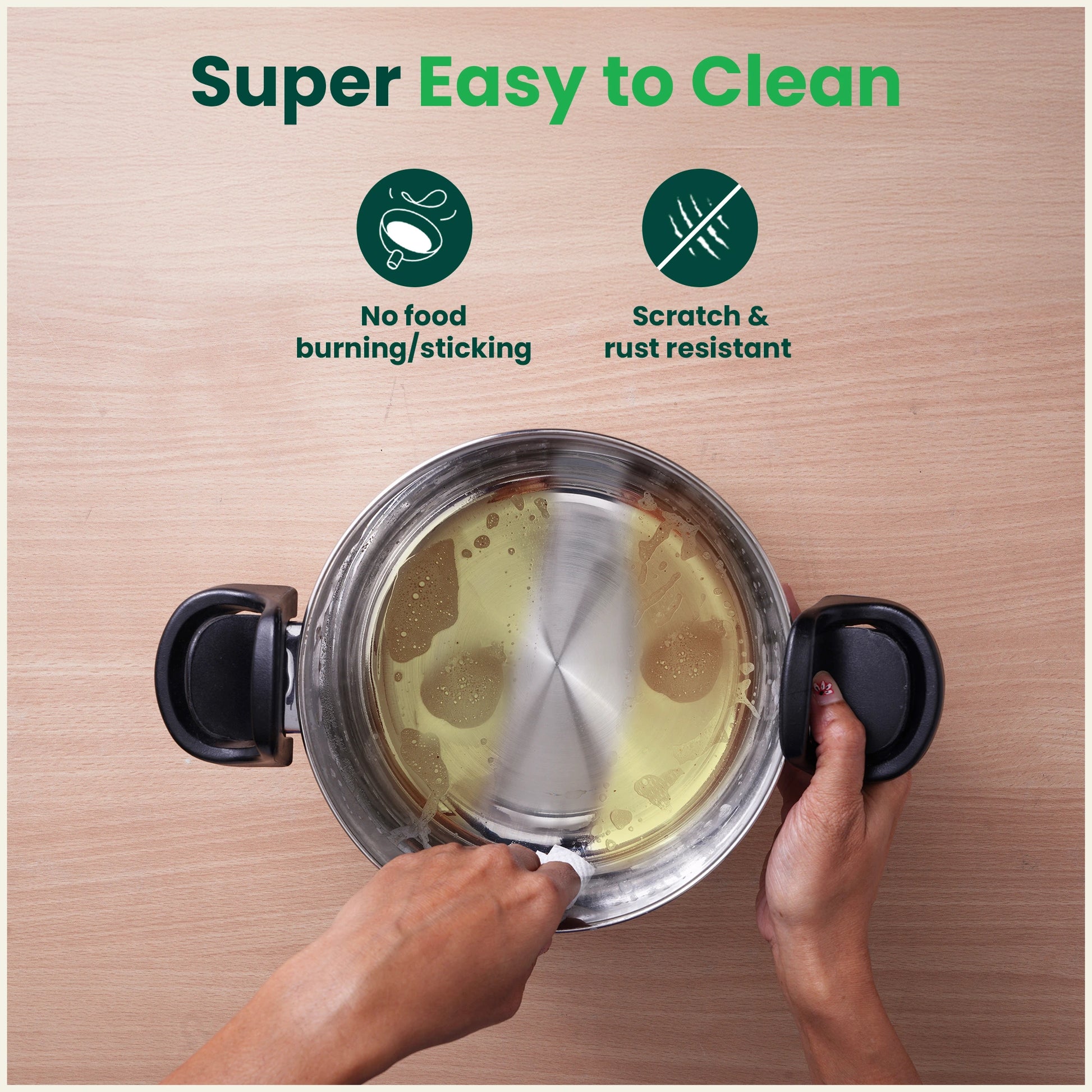 • EASY TO CLEAN: Stainless steel body with triply base prevents water stains at the bottom. Prevents food burning or sticking to the plates/surface. So, no cleaning hassles.