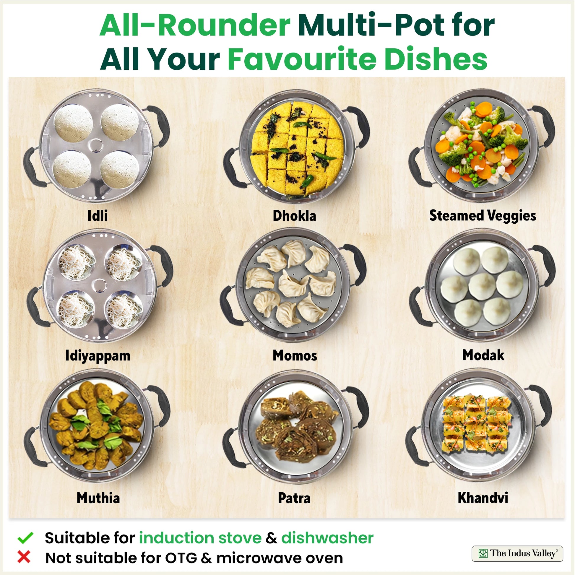 - 💪100% FOOD SAFE:The Indus Valley’s Premium Stainless Steel Idli Pot/Multi Pot/Steaming Set with 5 Plates is 100% toxin-free. It has no chemical or artificial coating.