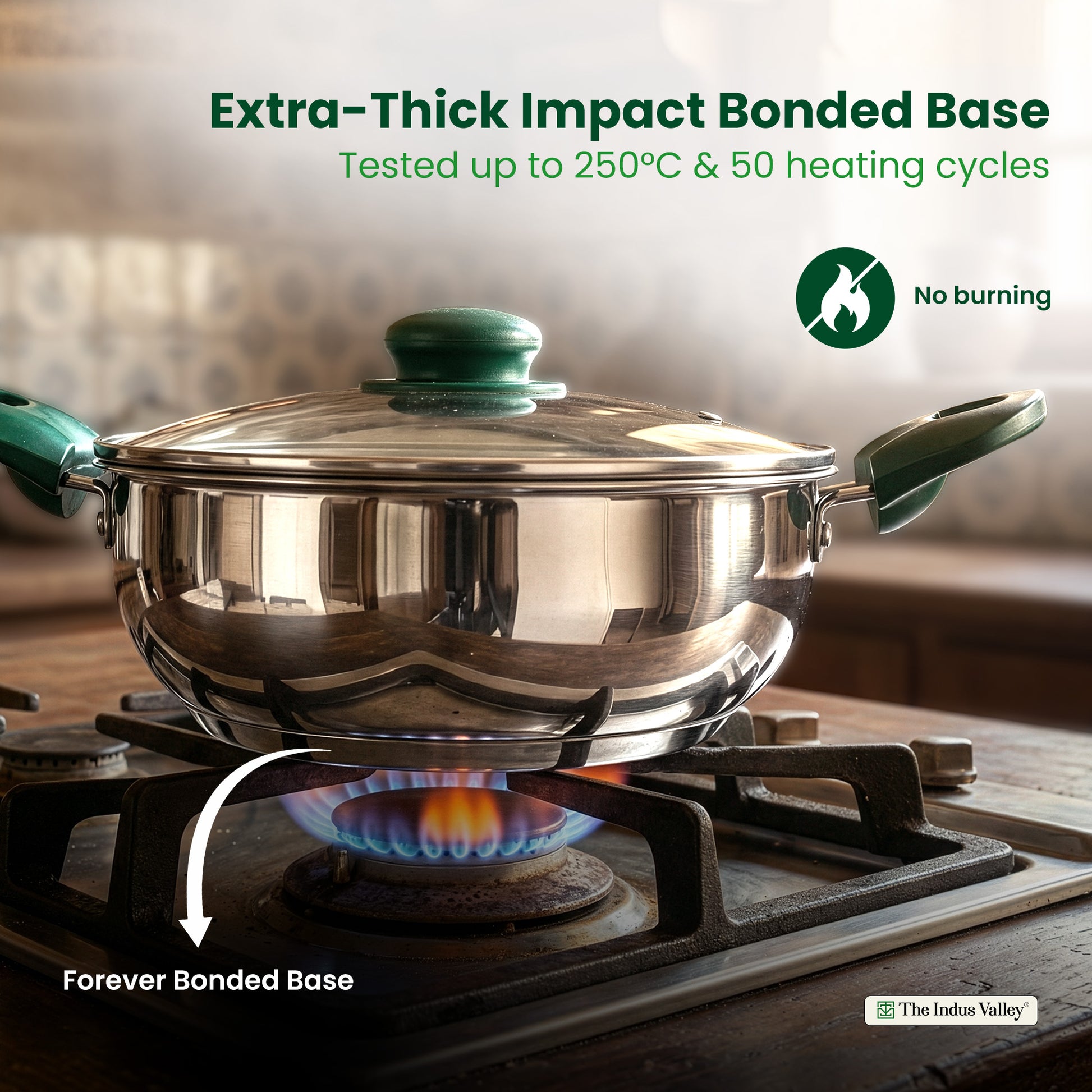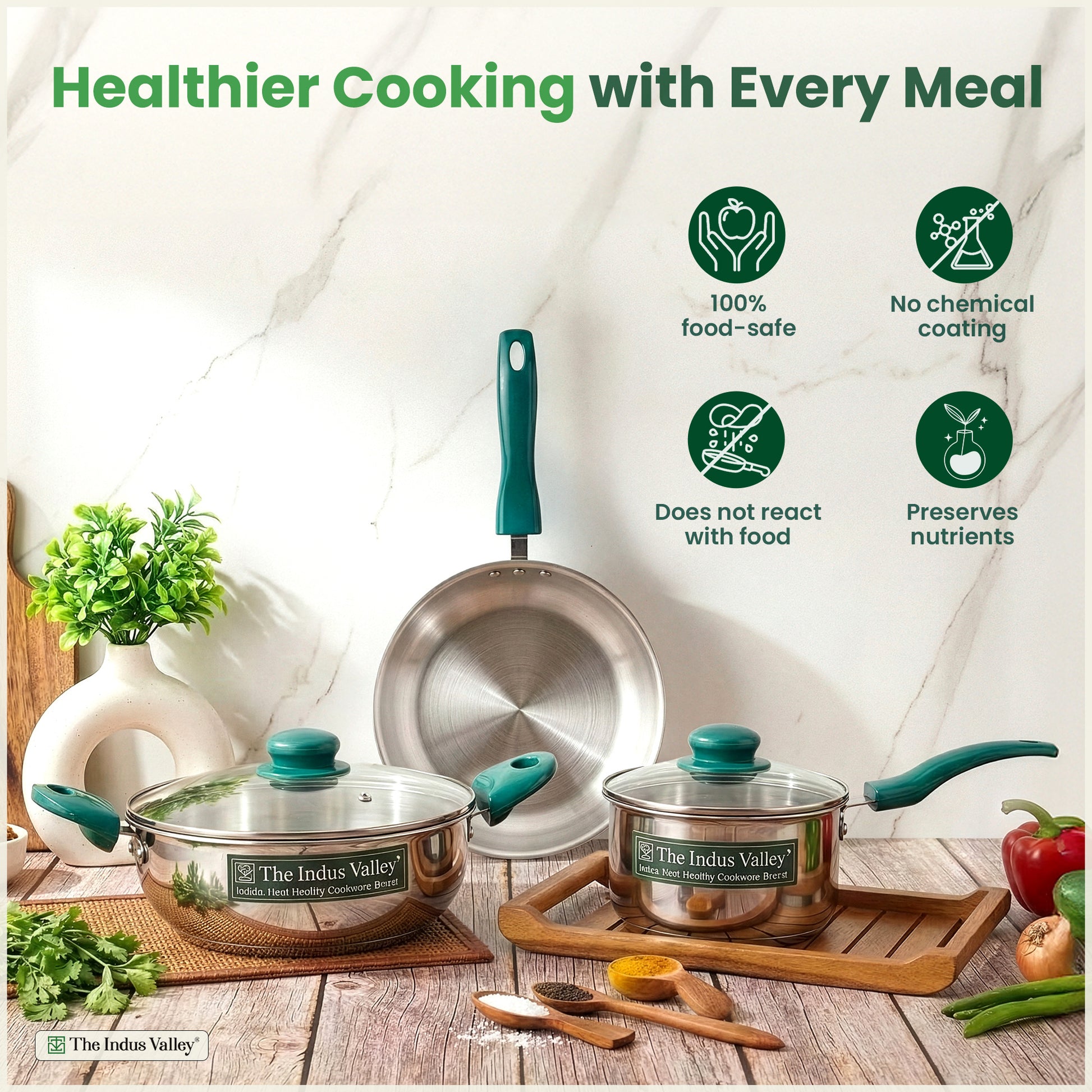 | The Indus Valley Tri-steel Cookware | Low Grade Steel Cookware | Non-Stick Aluminium Cookware | |