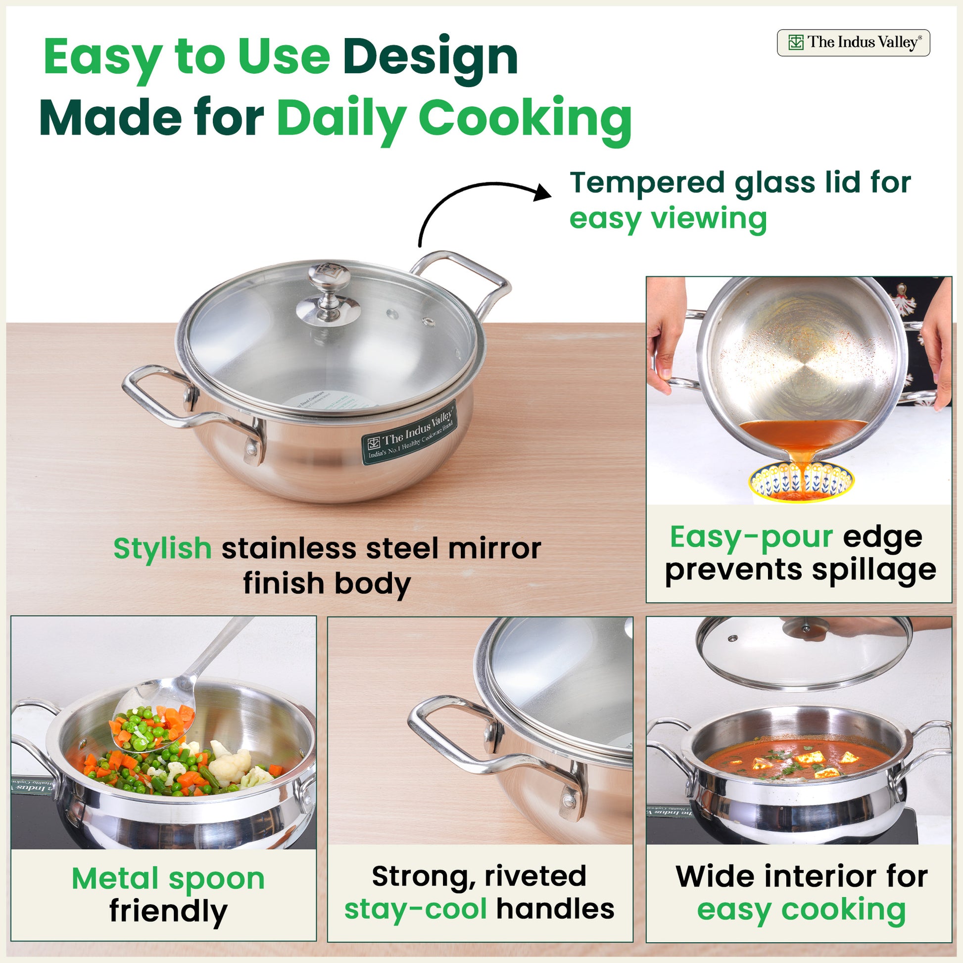 | The Indus Valley Tri-ply Cookware | Low Grade Steel Kadai | Non-stick Aluminium Kadai | |