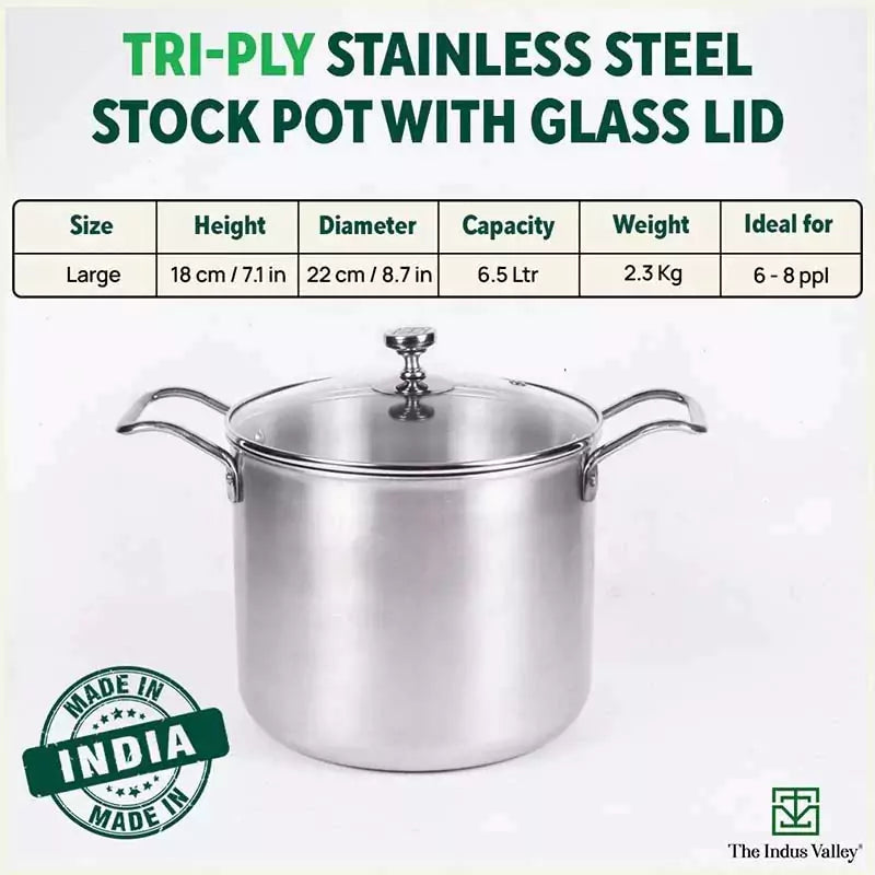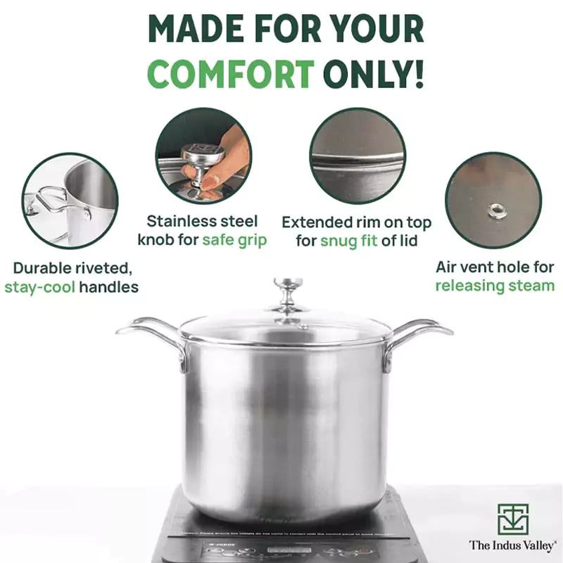 - 👌100% TOXIN-FREE:The Indus Valley’s TurboCukTM Tri-ply Stainless Steel Tall Stock Pot / Rice Cooking Pot/ Biryani Pot / Casserole with Glass Lid is truly healthy! Made from 100% food safe Stainless Steel (304 Grade), it is totally free from toxic coating.